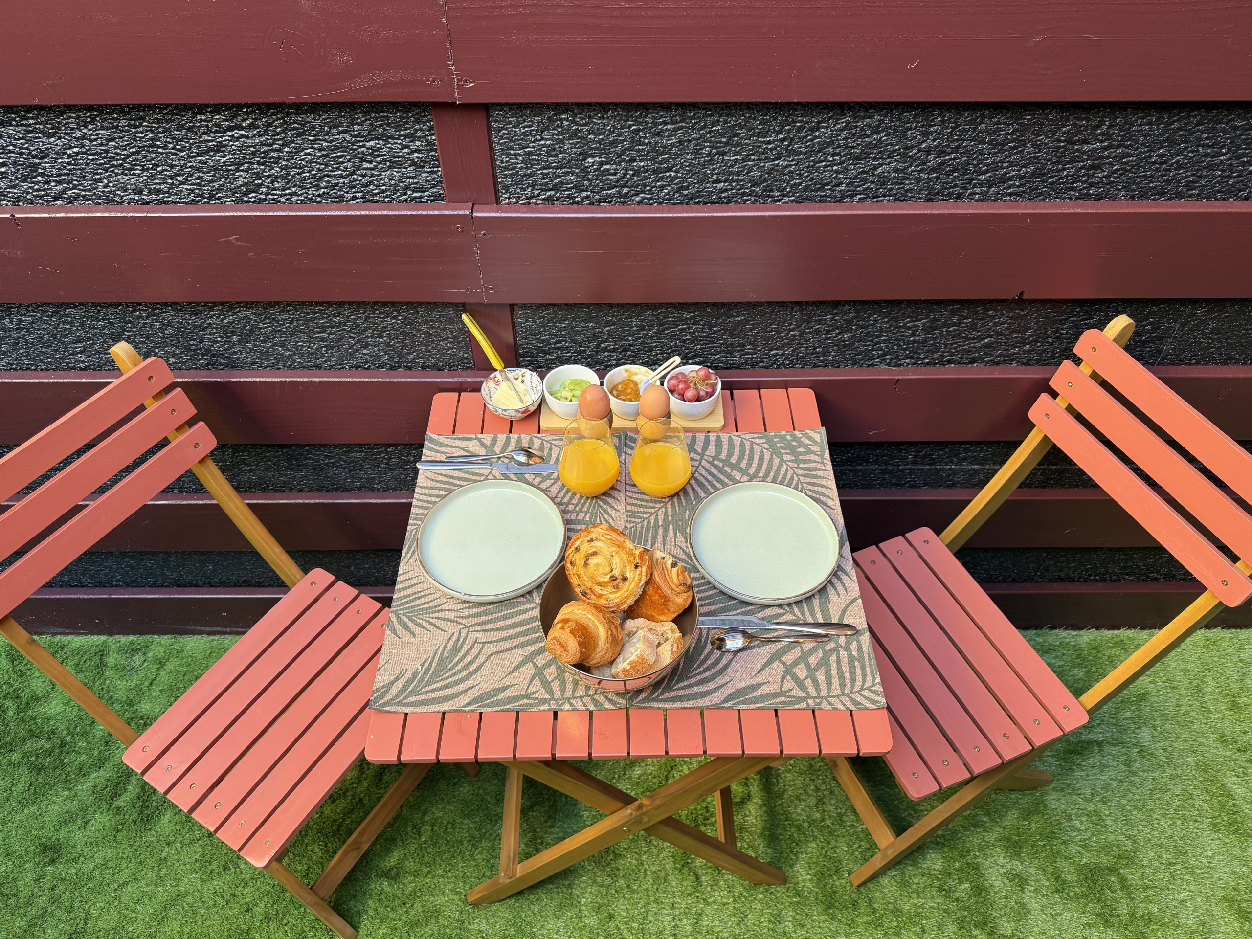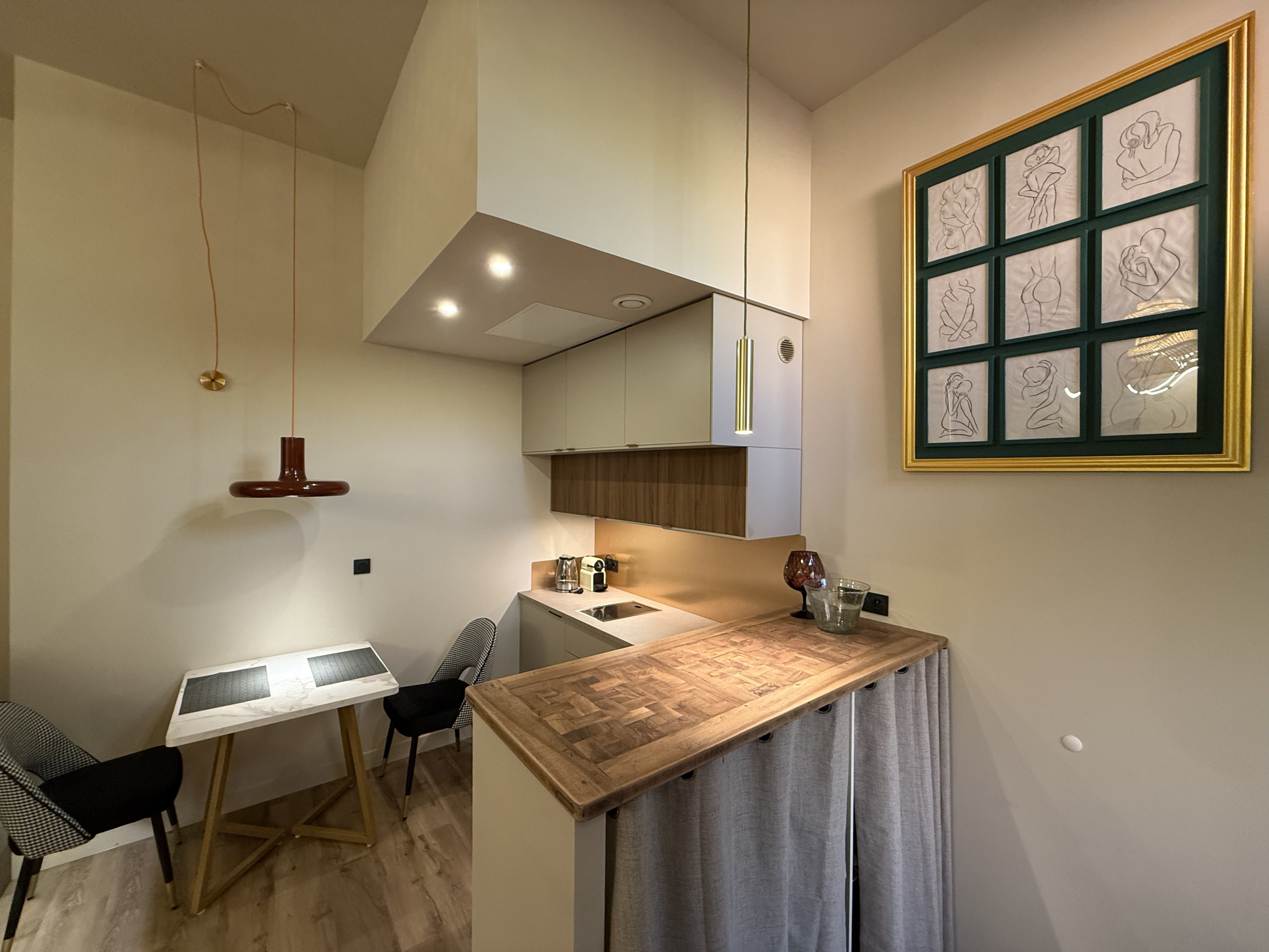 Une cuisine équipée est également à votre disposition pour préparer un repas et profiter pleinement de votre séjour. Un coin repas est aménagé pour savourer une coupe de champagne ou un dîner romantique.