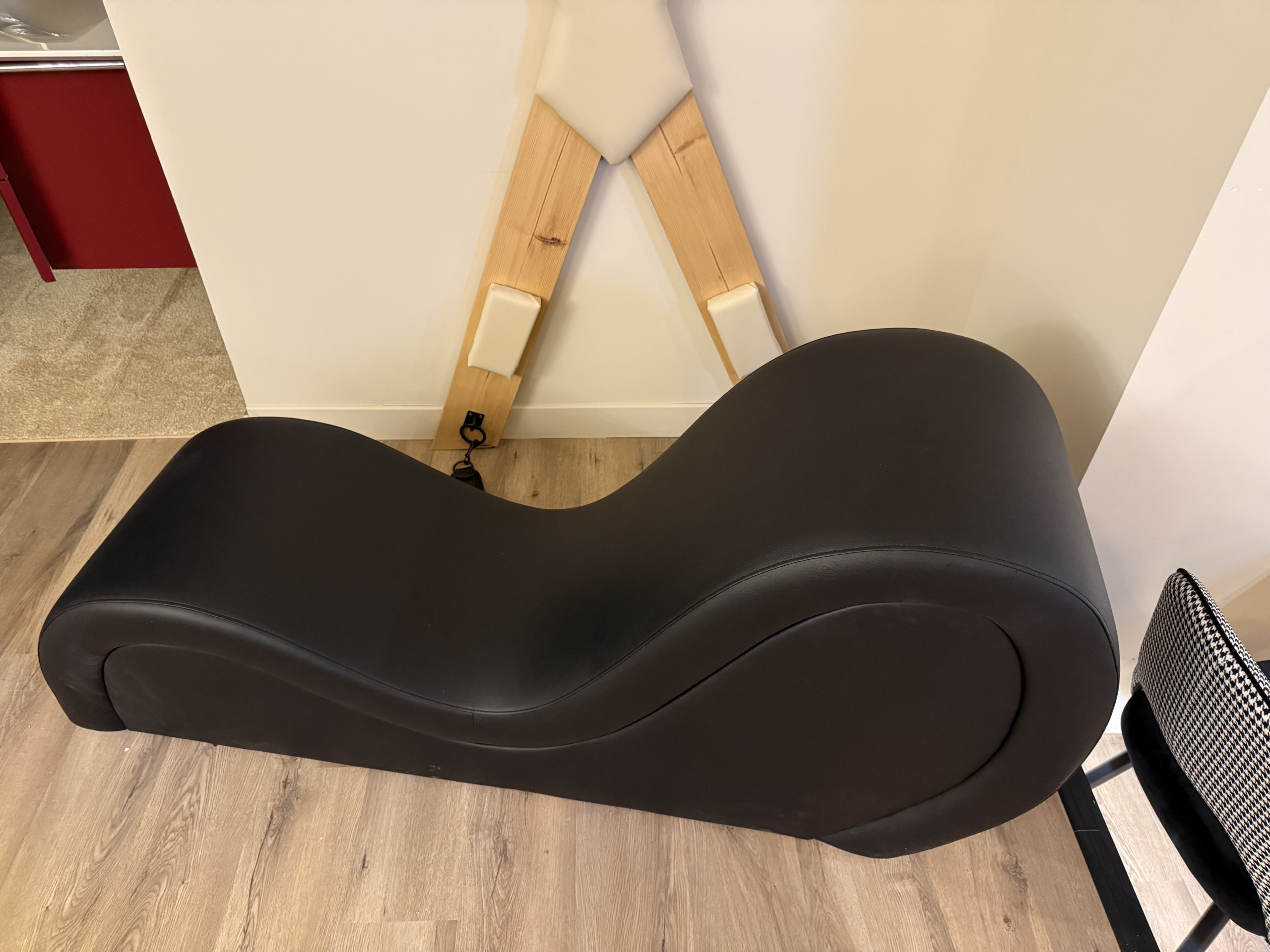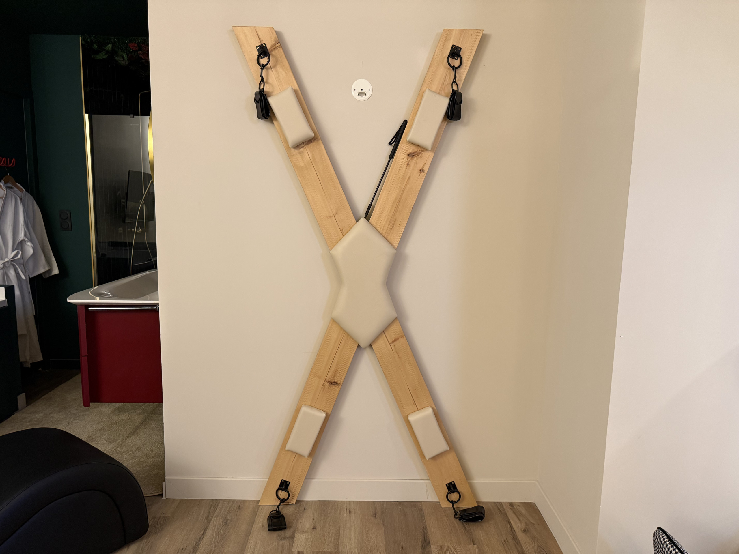 Profitez d’une baignoire balnéo, parfaite pour un moment de relaxation en duo, ainsi que d’une grande douche double. Pour ceux qui souhaitent explorer une expérience plus sensuelle, la suite dispose également d’une croix murale et d’un fauteuil tantrique, conçu pour découvrir de nouvelles sensations en couple.