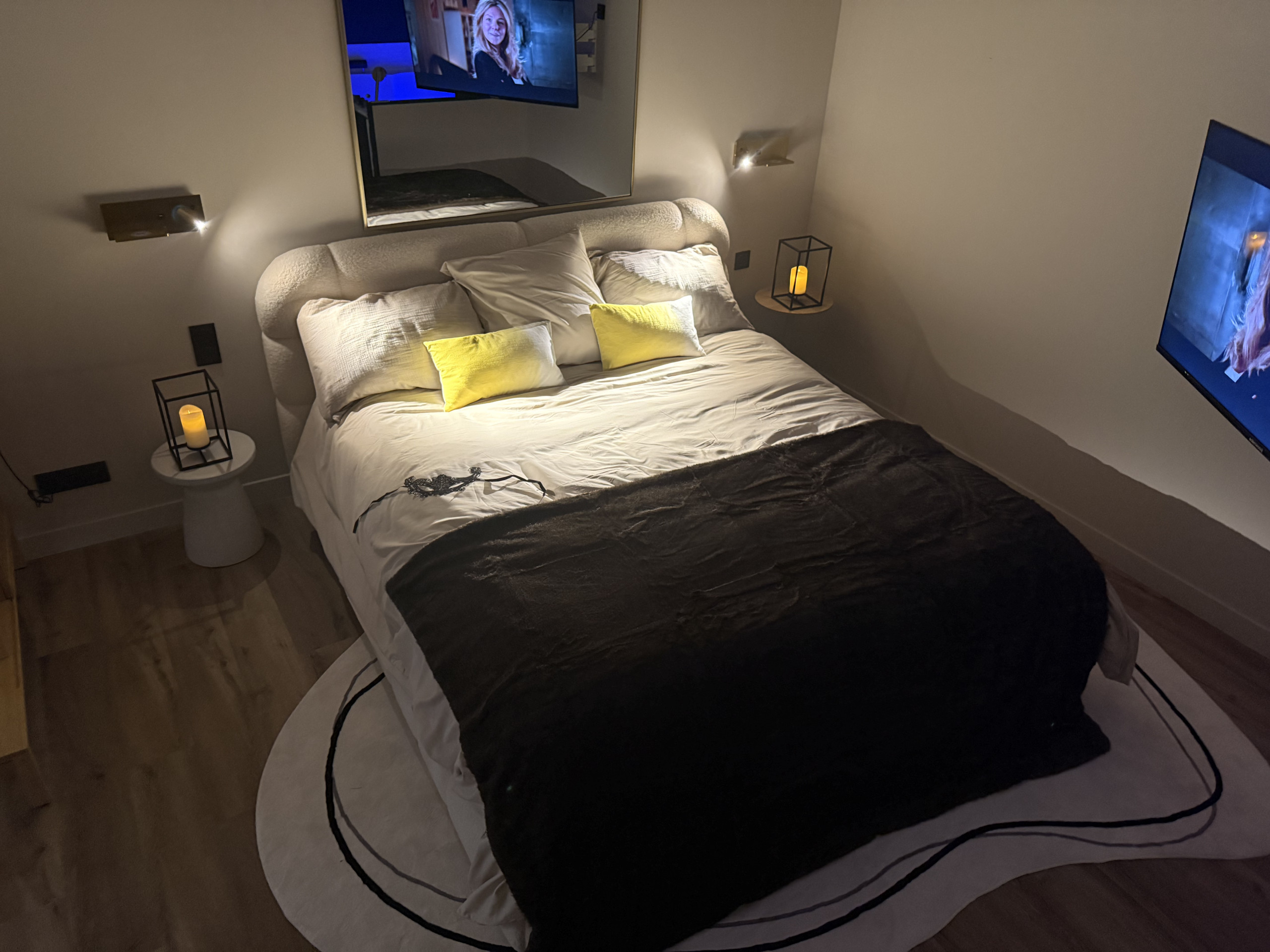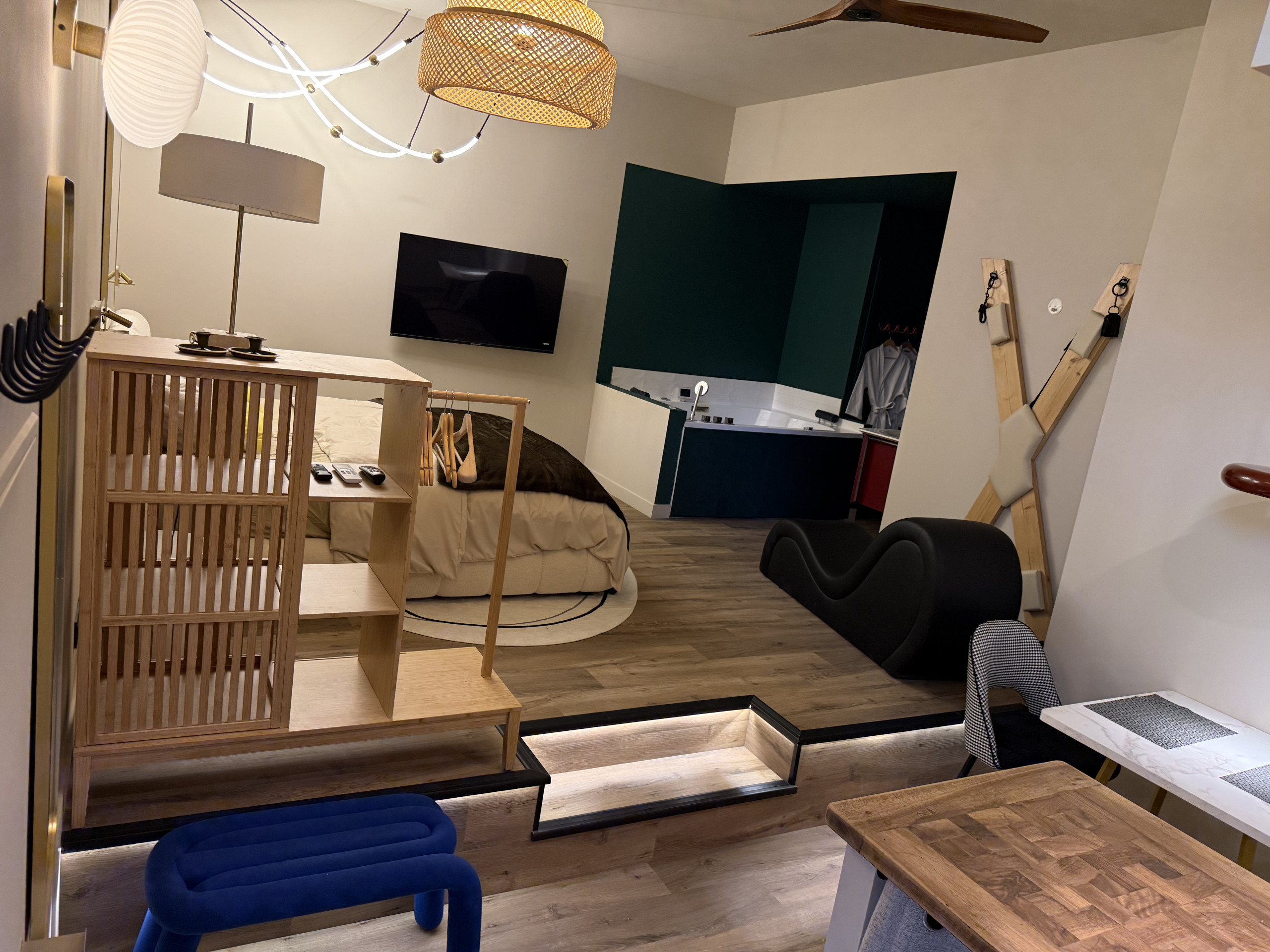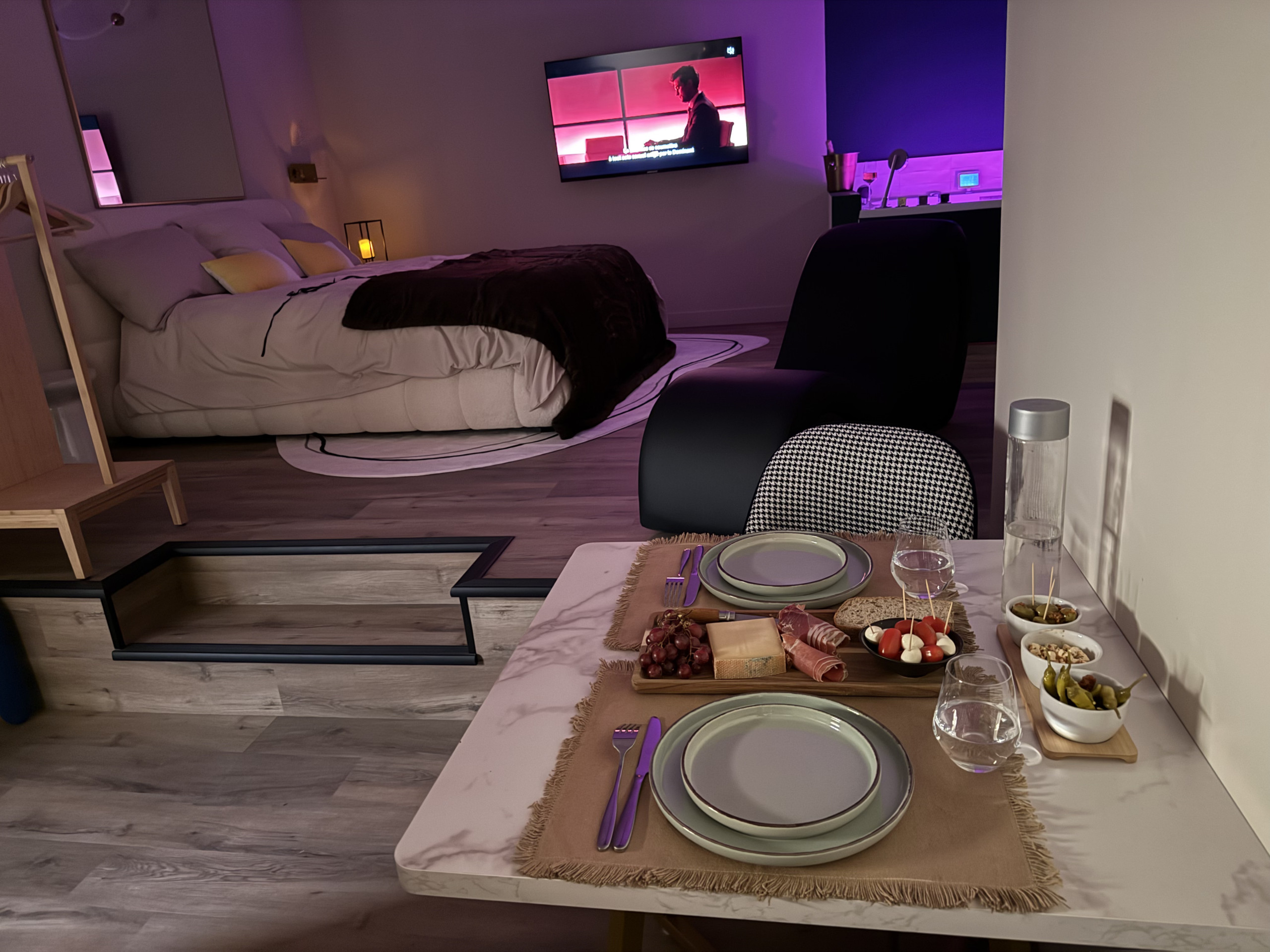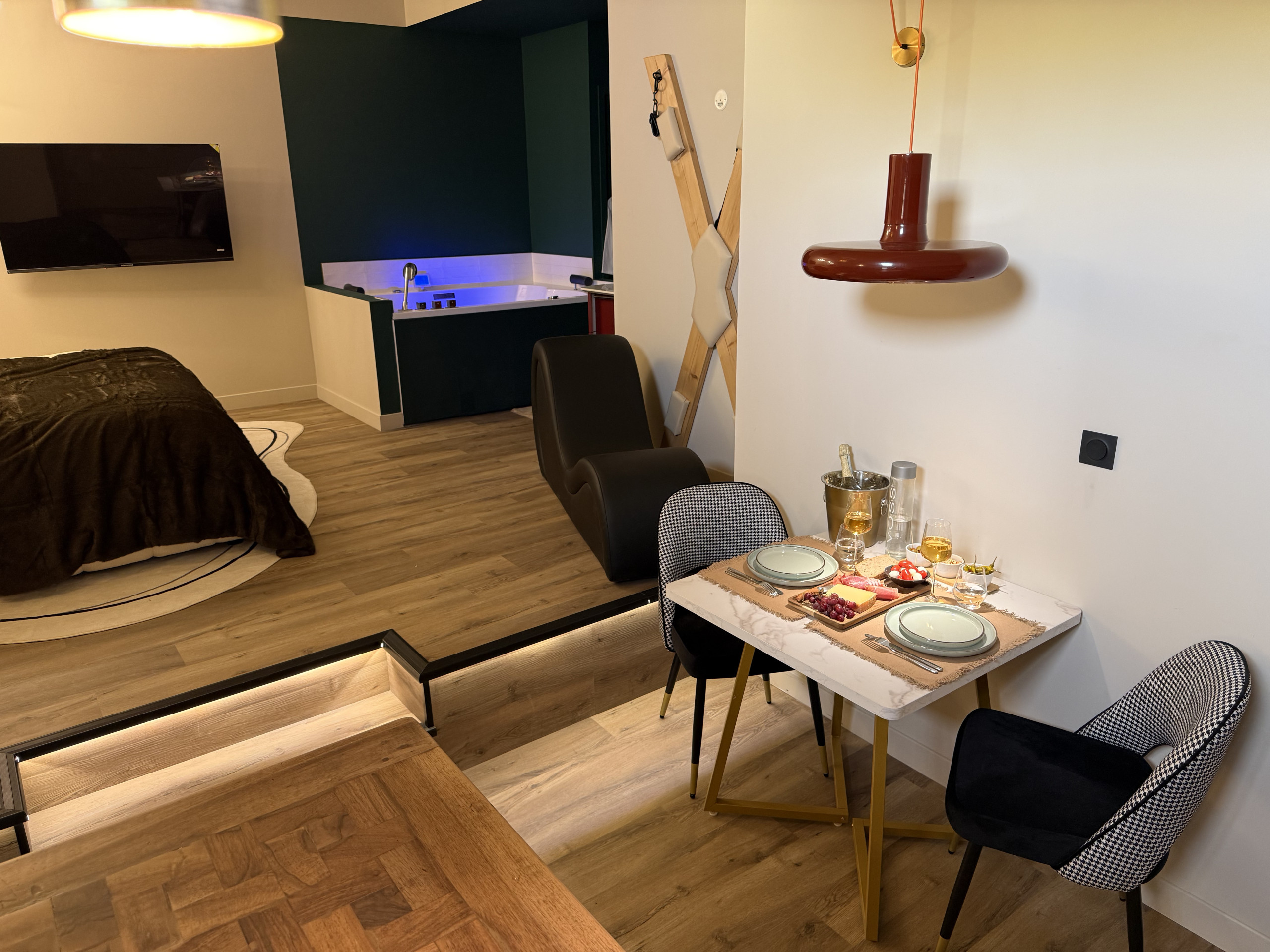 Dès votre arrivée, plongez dans une ambiance intimiste et élégante, avec éclairages tamisés et décoration soigneusement pensée pour une escapade romantique à deux.