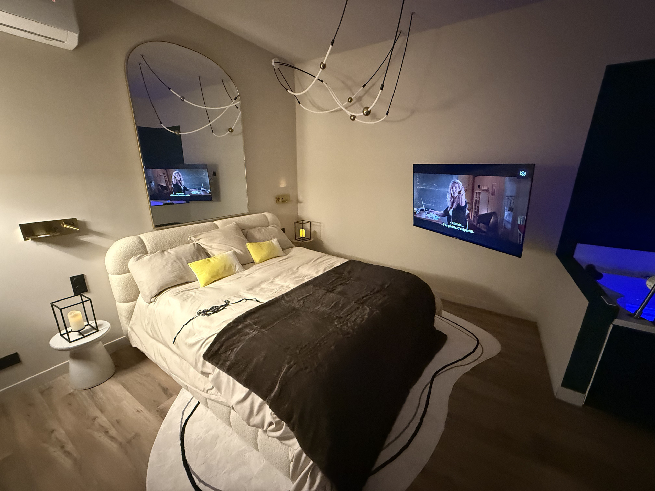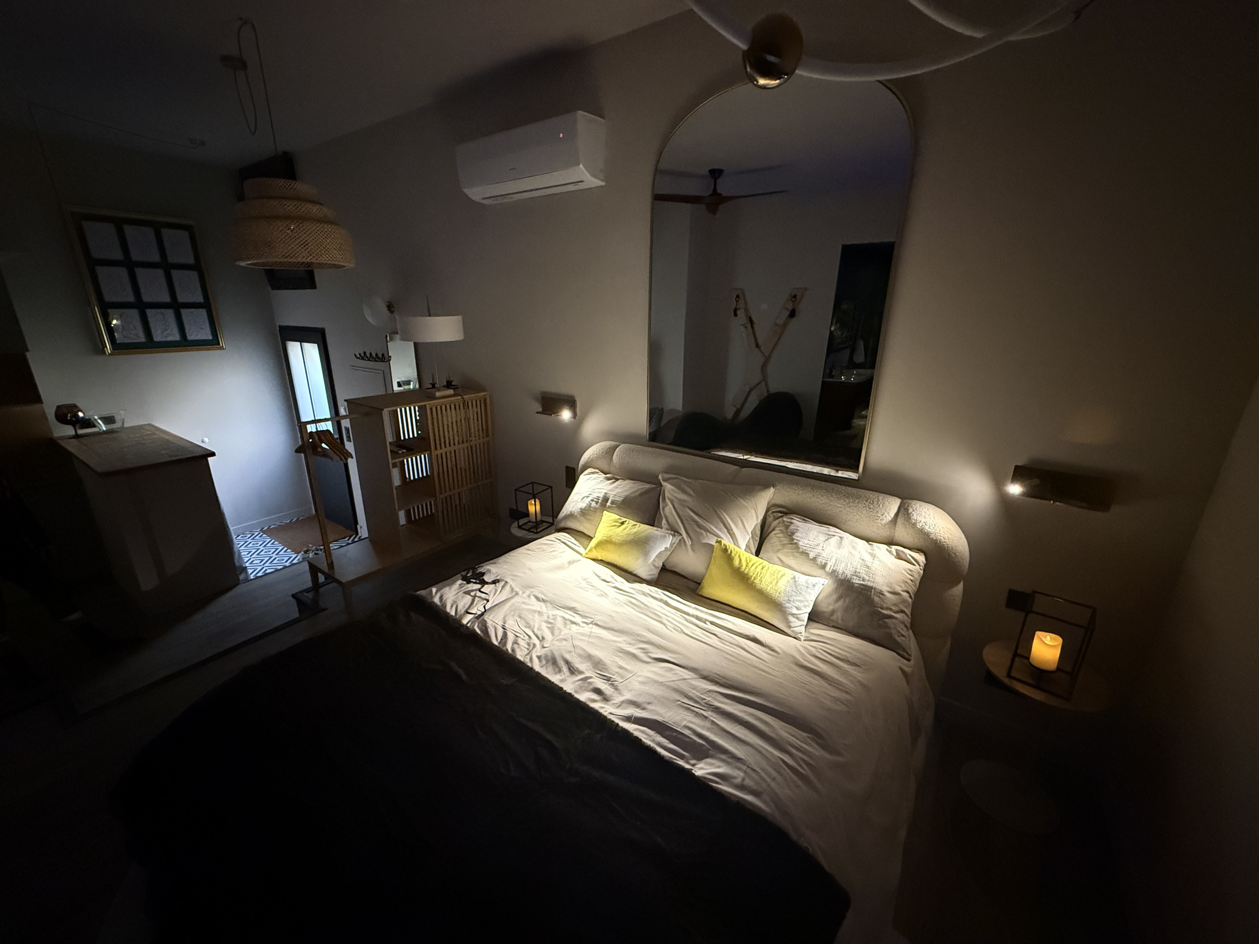 La chambre dispose d’un lit king size, d’une superbe décoration moderne, et d’un espace chaleureux pour partager un moment privilégié.
