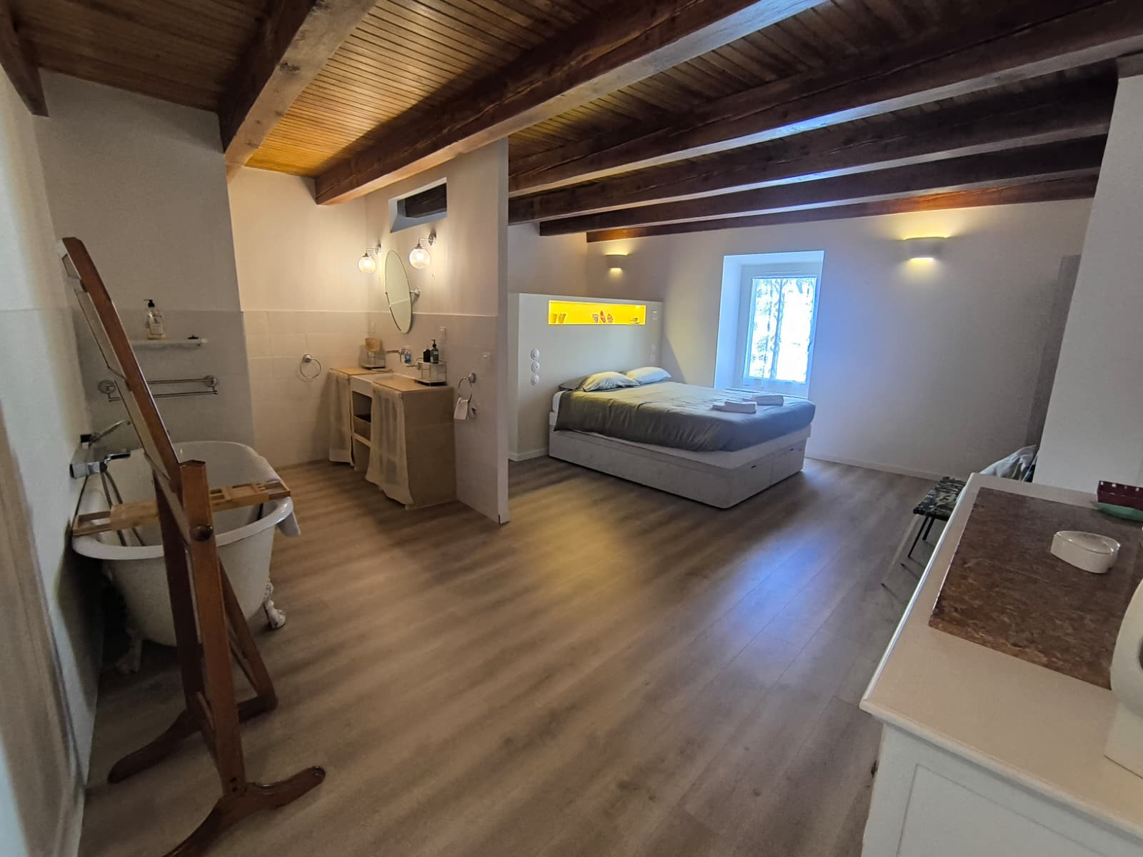 La cuisine américaine, équipée d’une plaque de cuisson au gaz, comprend un réfrigérateur, un congélateur, un four, un micro-ondes, un lave-vaisselle, une cafetière, une bouilloire, un grille-pain ainsi que toute la vaisselle et les ustensiles nécessaires pour cuisiner facilement sur place.