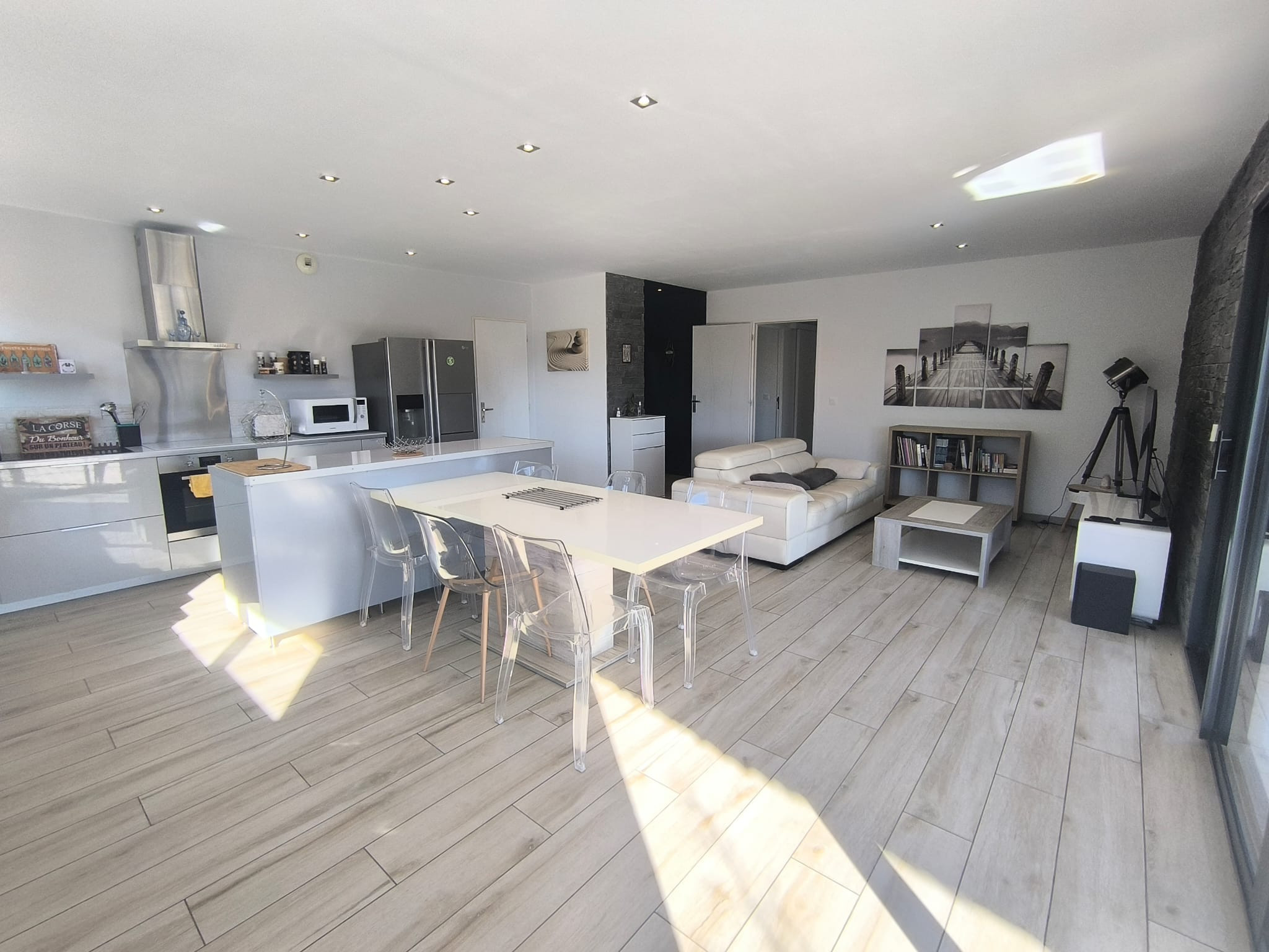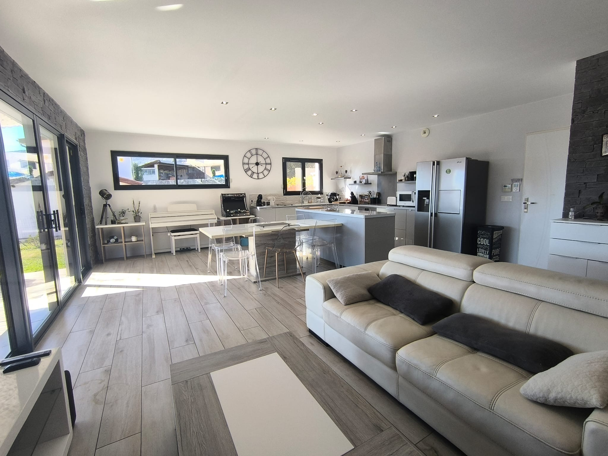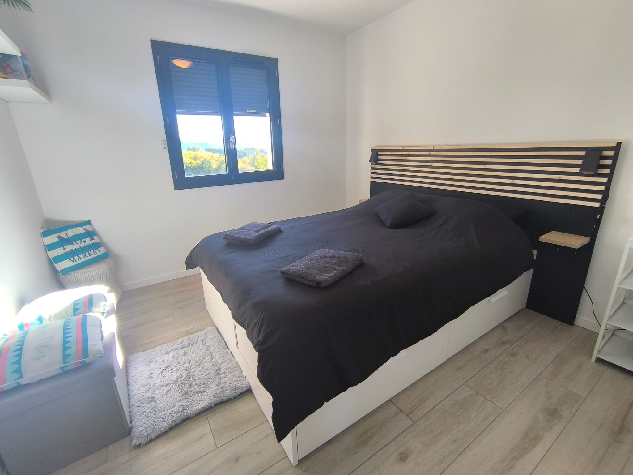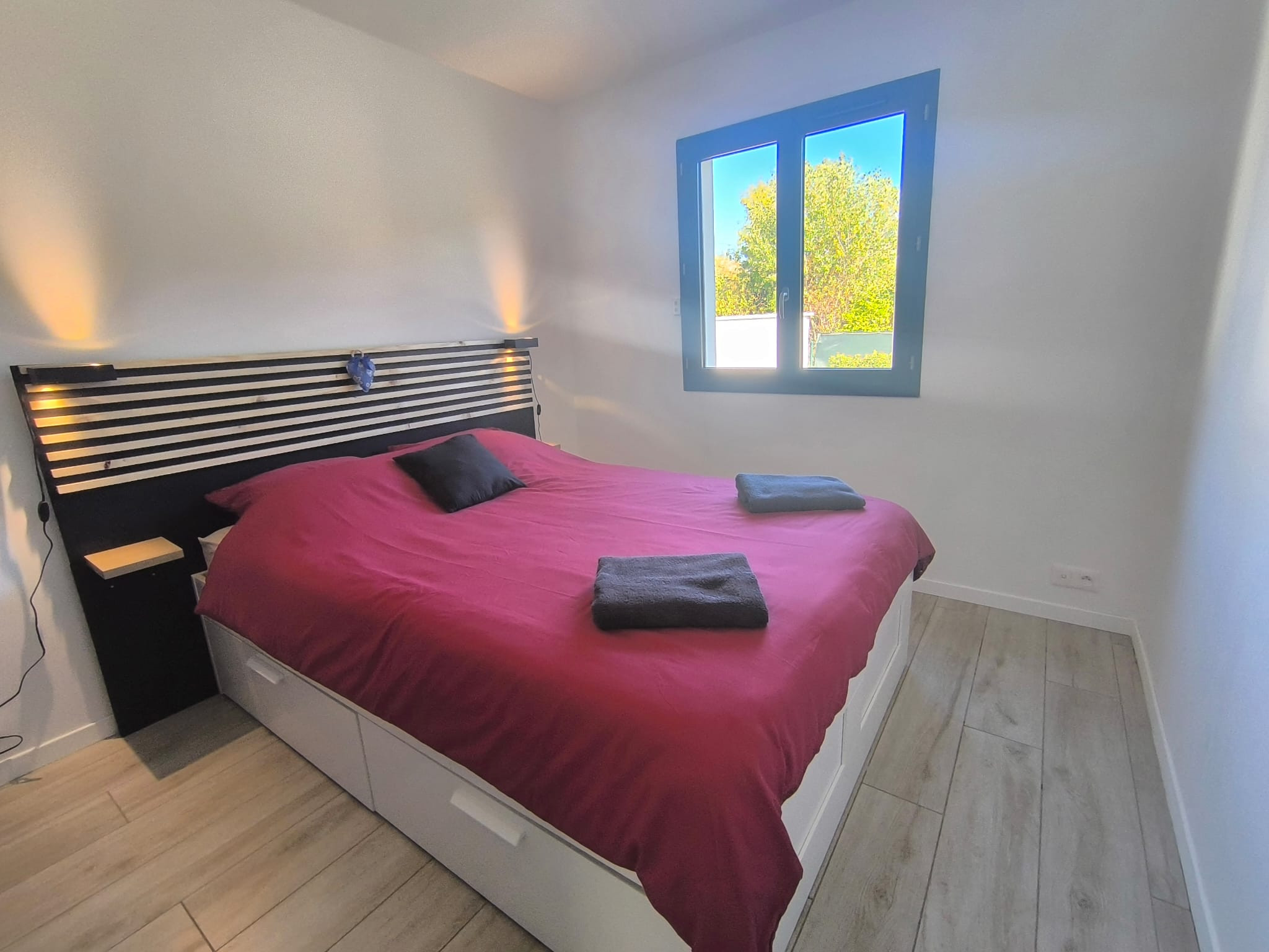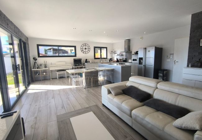 À l'intérieur, un salon lumineux ouvert sur l'extérieur et une cuisine américaine moderne (plaques à induction) entièrement équipée : réfrigérateur, congélateur, four, micro-ondes, lave-vaisselle, vaisselle/ustensiles, cafetière, grille-pain, bouilloire, presse-agrumes. Le quotidien est facile : Wi-Fi haut débit, TV, alarme, pompe à chaleur, lave-linge et sèche-linge, fer à repasser et sèche-cheveux ; et vous pouvez vous garer directement sur place. Tout est prêt pour un séjour confortable et sans complications. Réservez, détendez-vous... et profitez ! 🌿