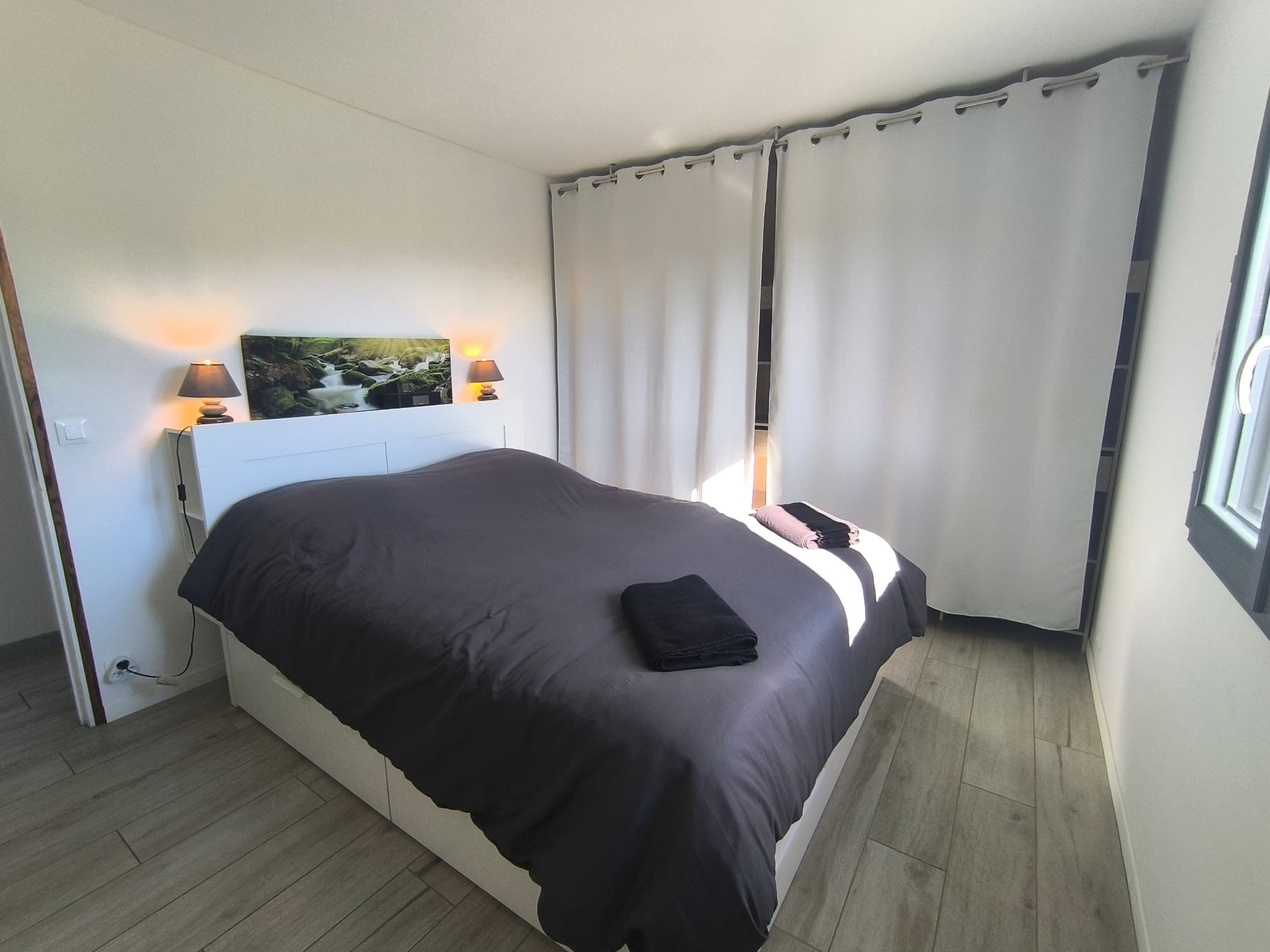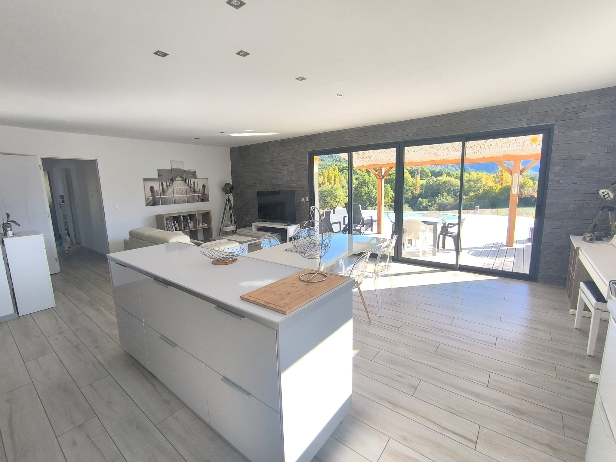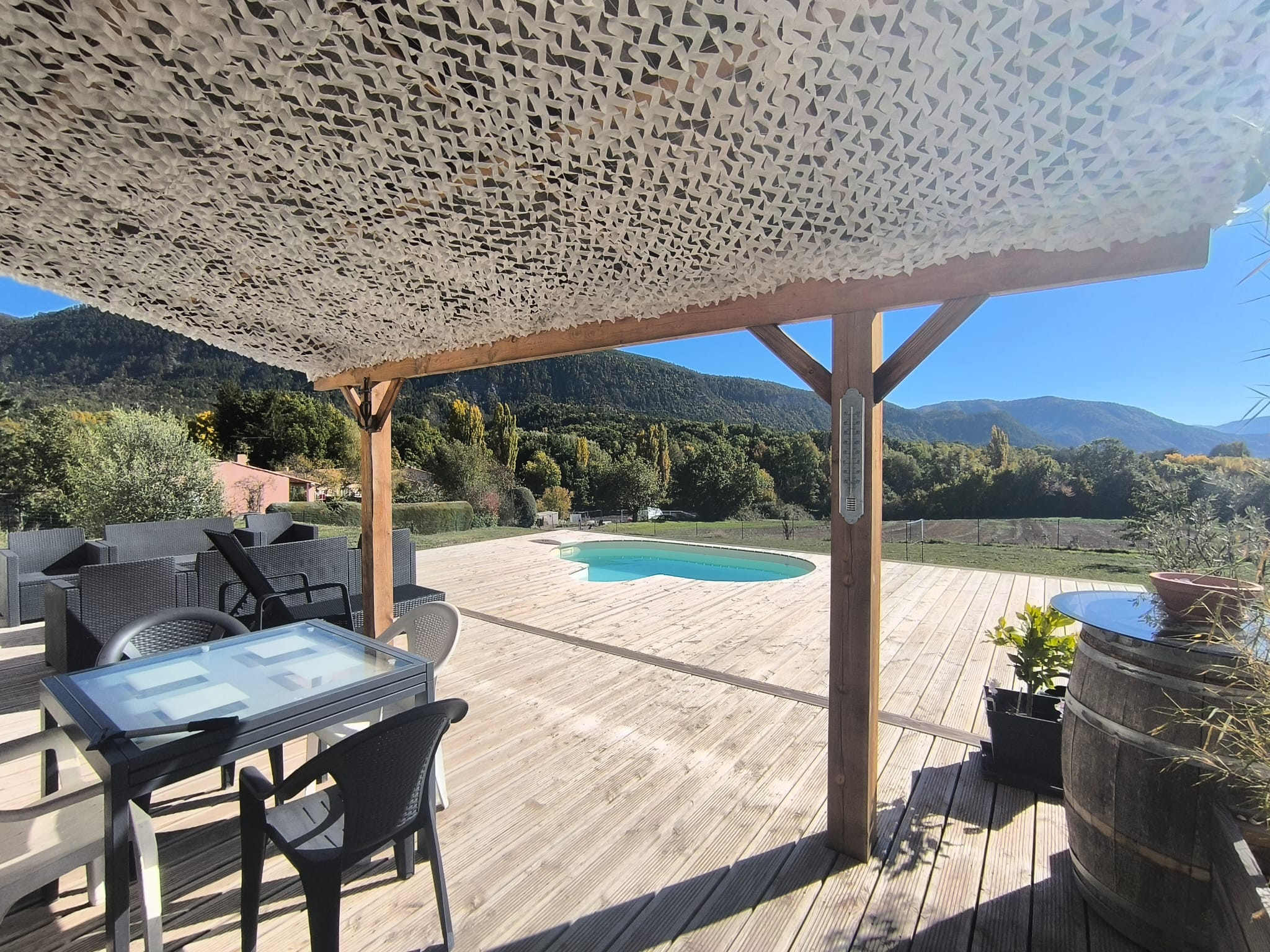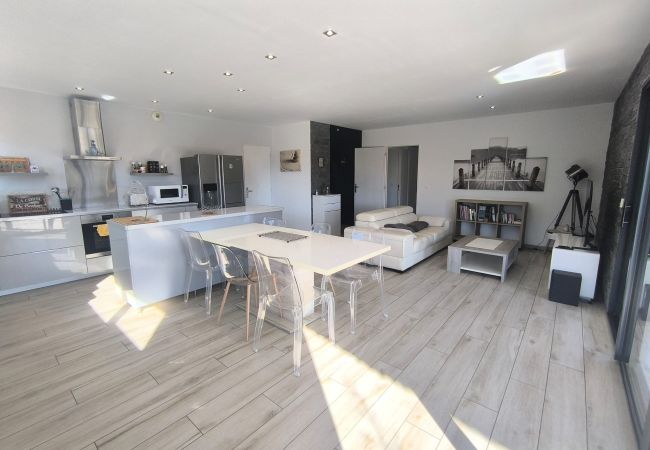 À l'intérieur, un salon lumineux ouvert sur l'extérieur et une cuisine américaine moderne (plaques à induction) entièrement équipée : réfrigérateur, congélateur, four, micro-ondes, lave-vaisselle, vaisselle/ustensiles, cafetière, grille-pain, bouilloire, presse-agrumes. Le quotidien est facile : Wi-Fi haut débit, TV, alarme, pompe à chaleur, lave-linge et sèche-linge, fer à repasser et sèche-cheveux ; et vous pouvez vous garer directement sur place. Tout est prêt pour un séjour confortable et sans complications. Réservez, détendez-vous... et profitez ! 🌿