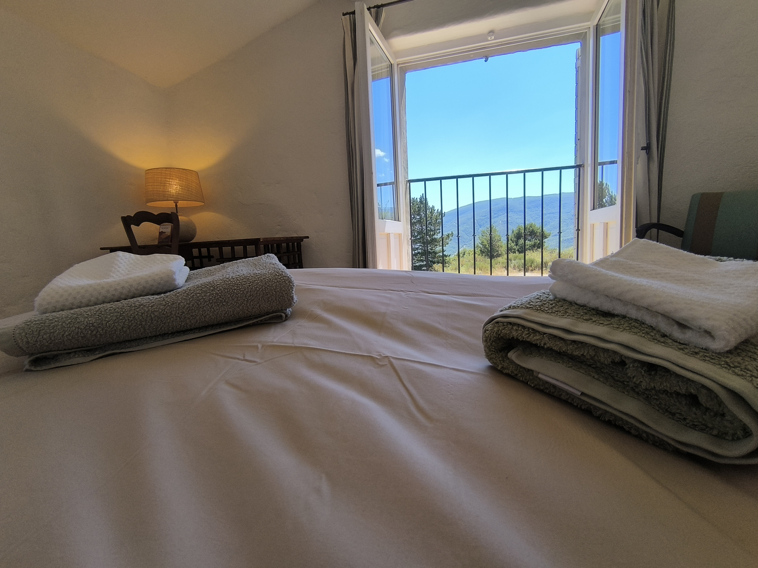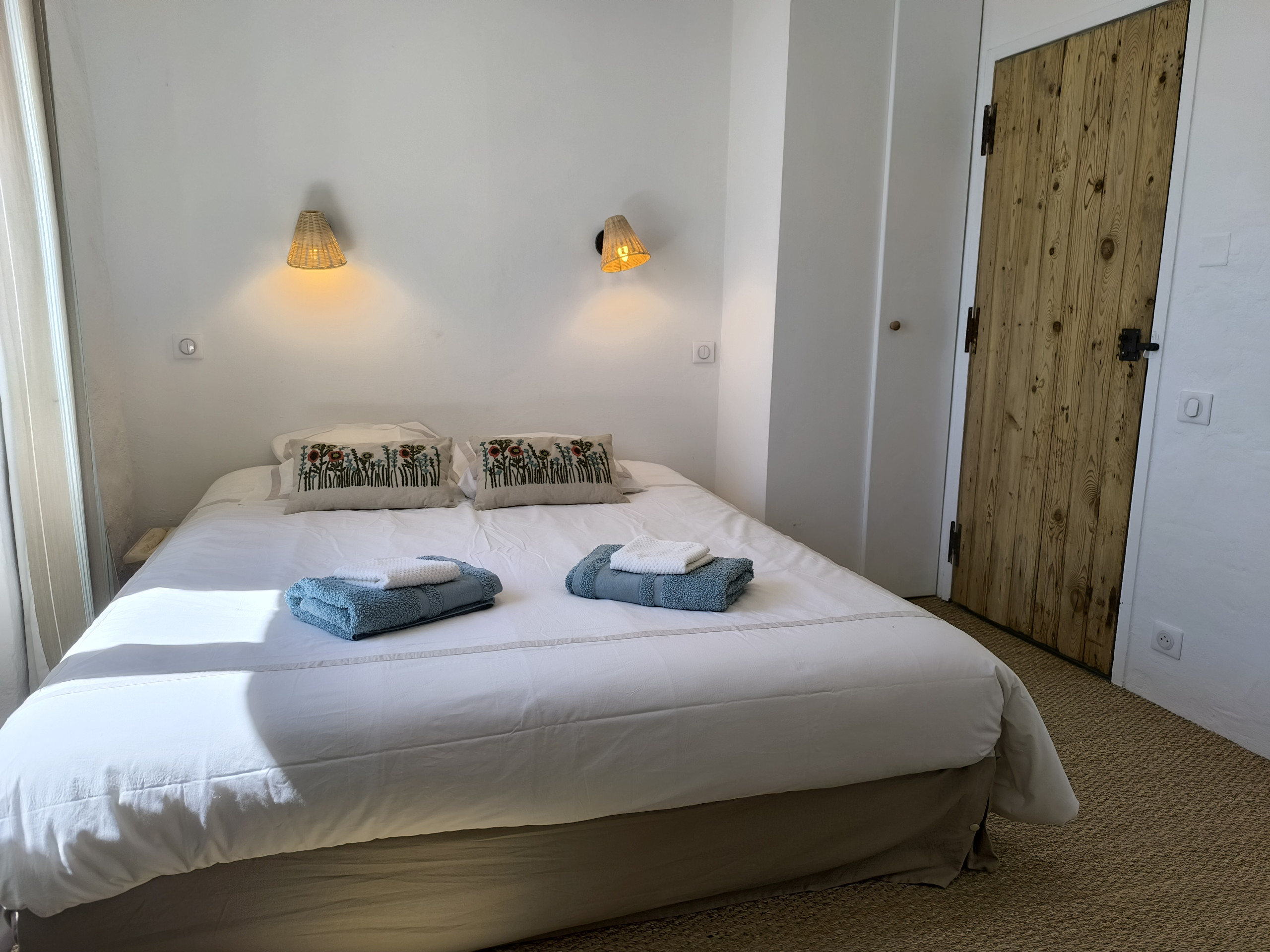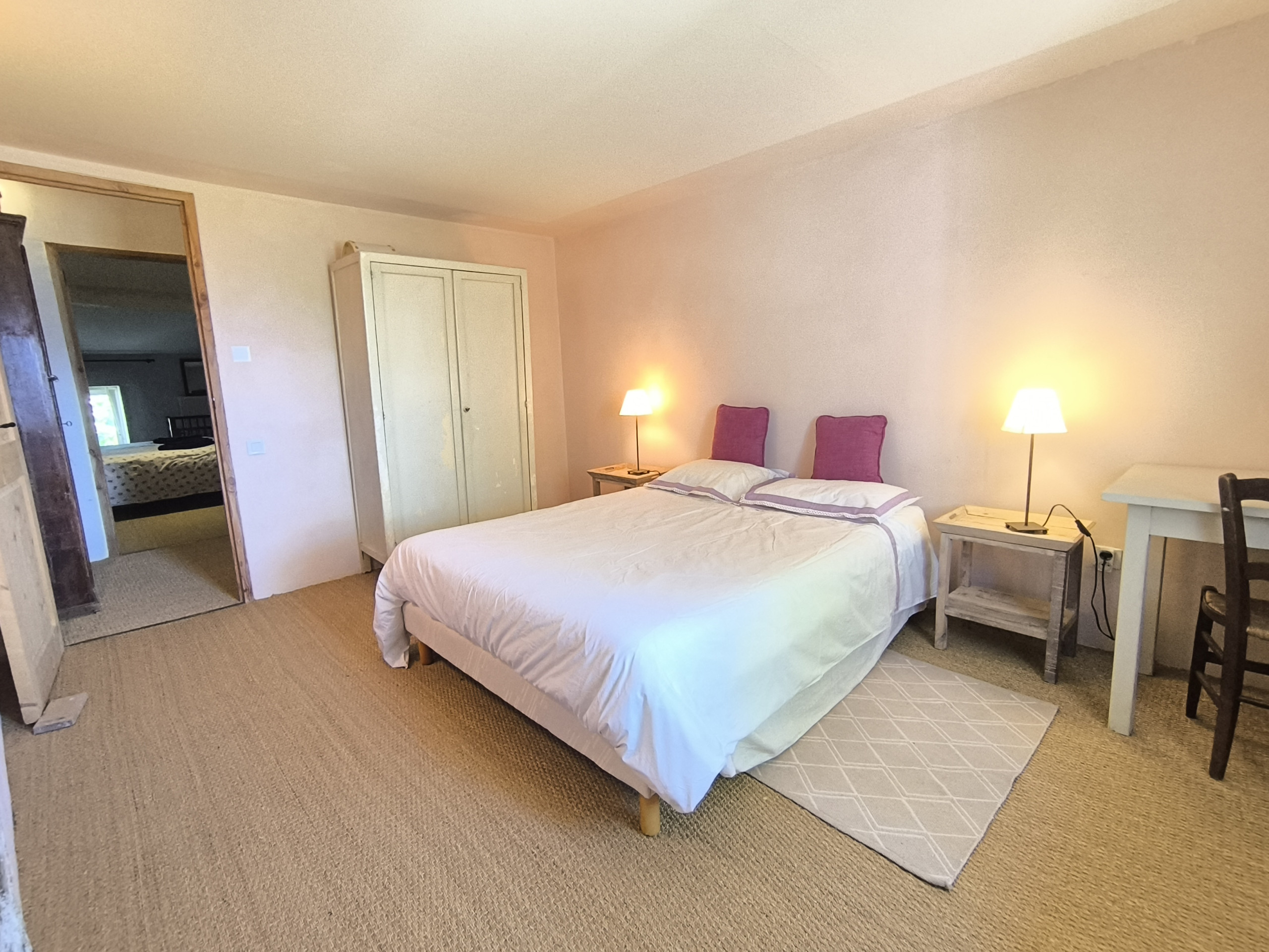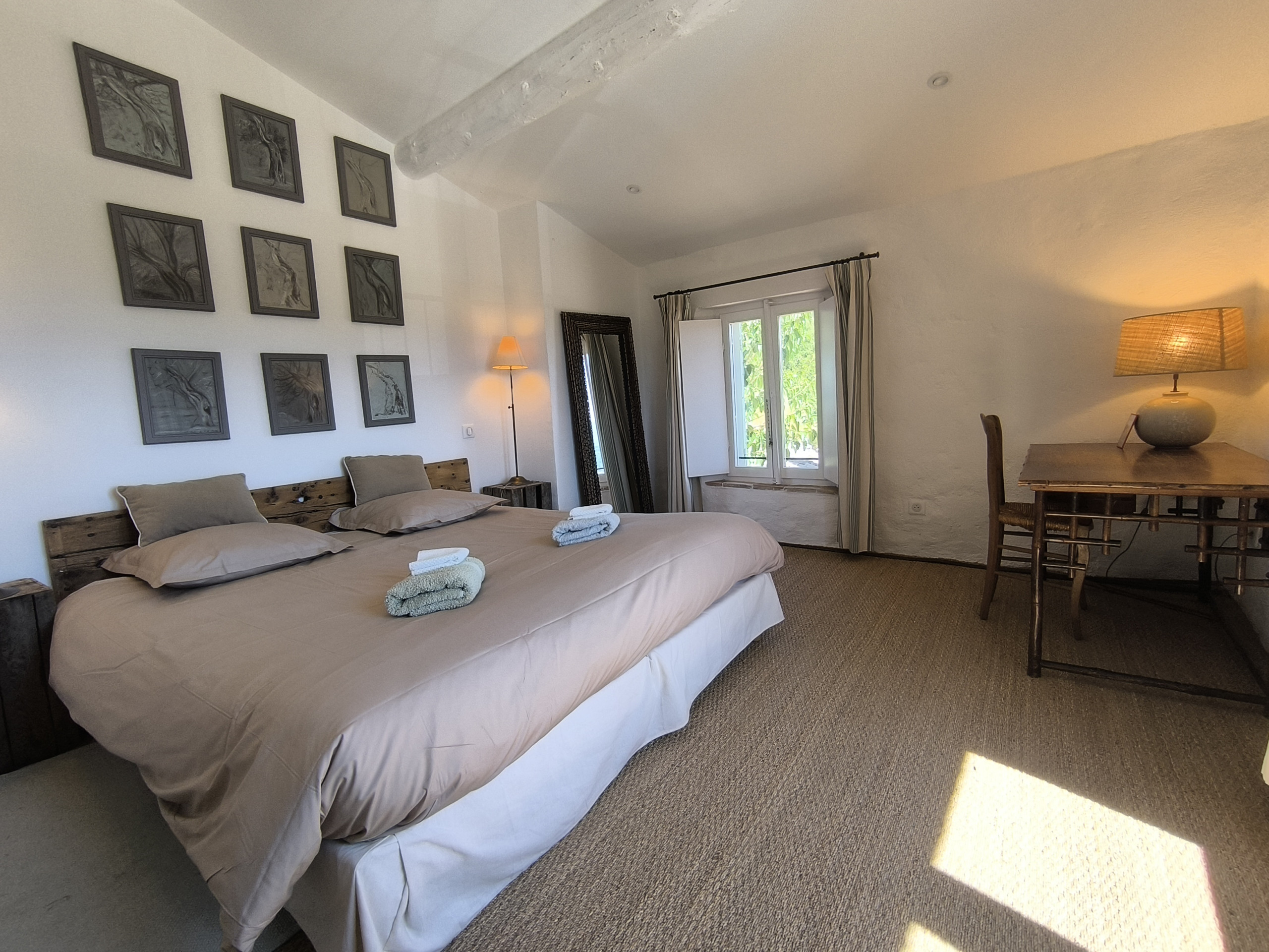 Prévue pour accueillir jusqu’à 16 personnes, elle offre une configuration idéale pour les familles et groupes d’amis: quatre chambres avec lit double, une chambre avec trois lits simples et une chambre avec deux lits simples, desservies par deux salles de bain et trois WC. Les chambres, sobres et lumineuses, ouvrent leurs fenêtres sur la garrigue et les crêtes lointaines; le chauffage au fioul assure un confort parfait hors saison.