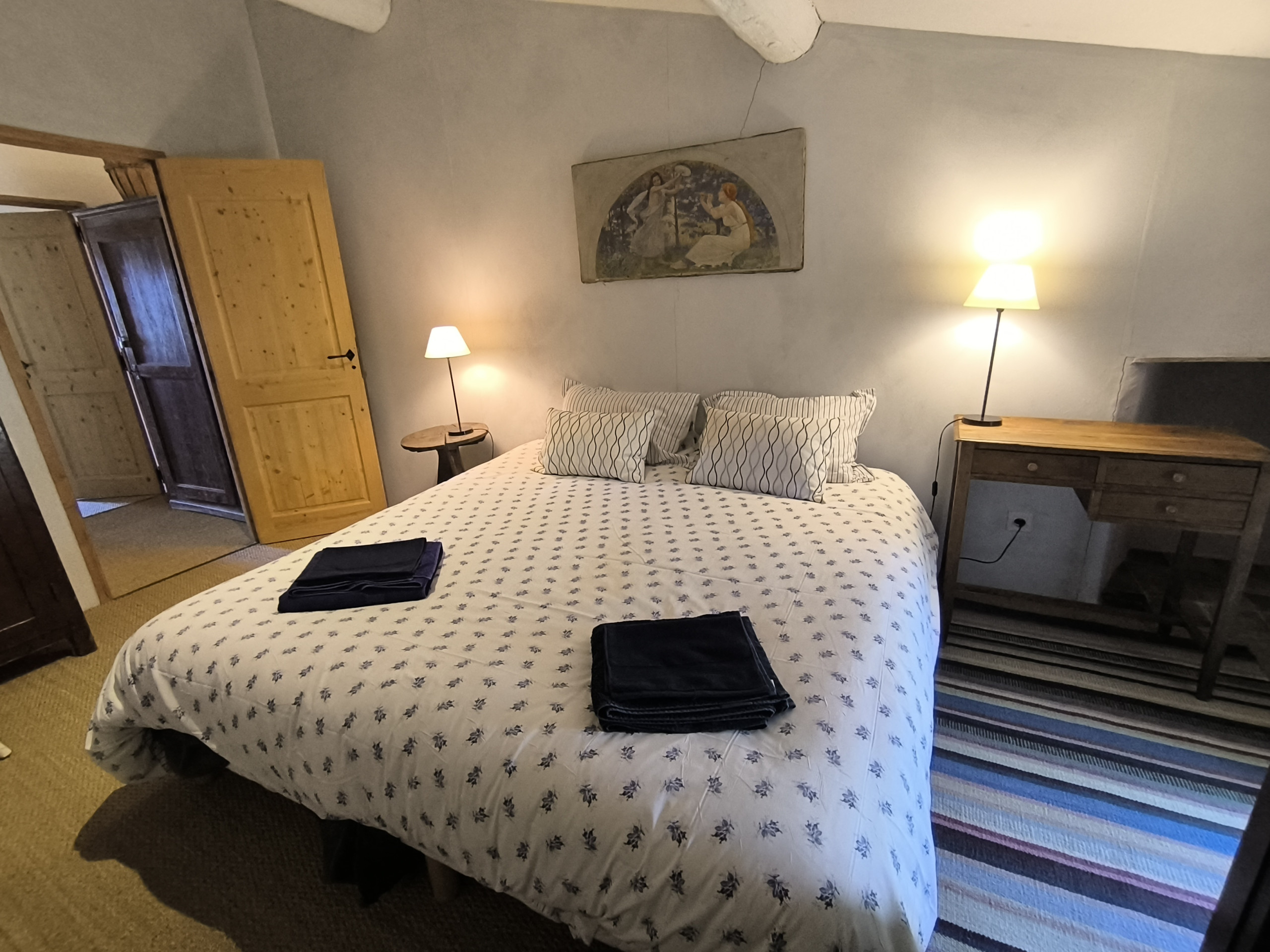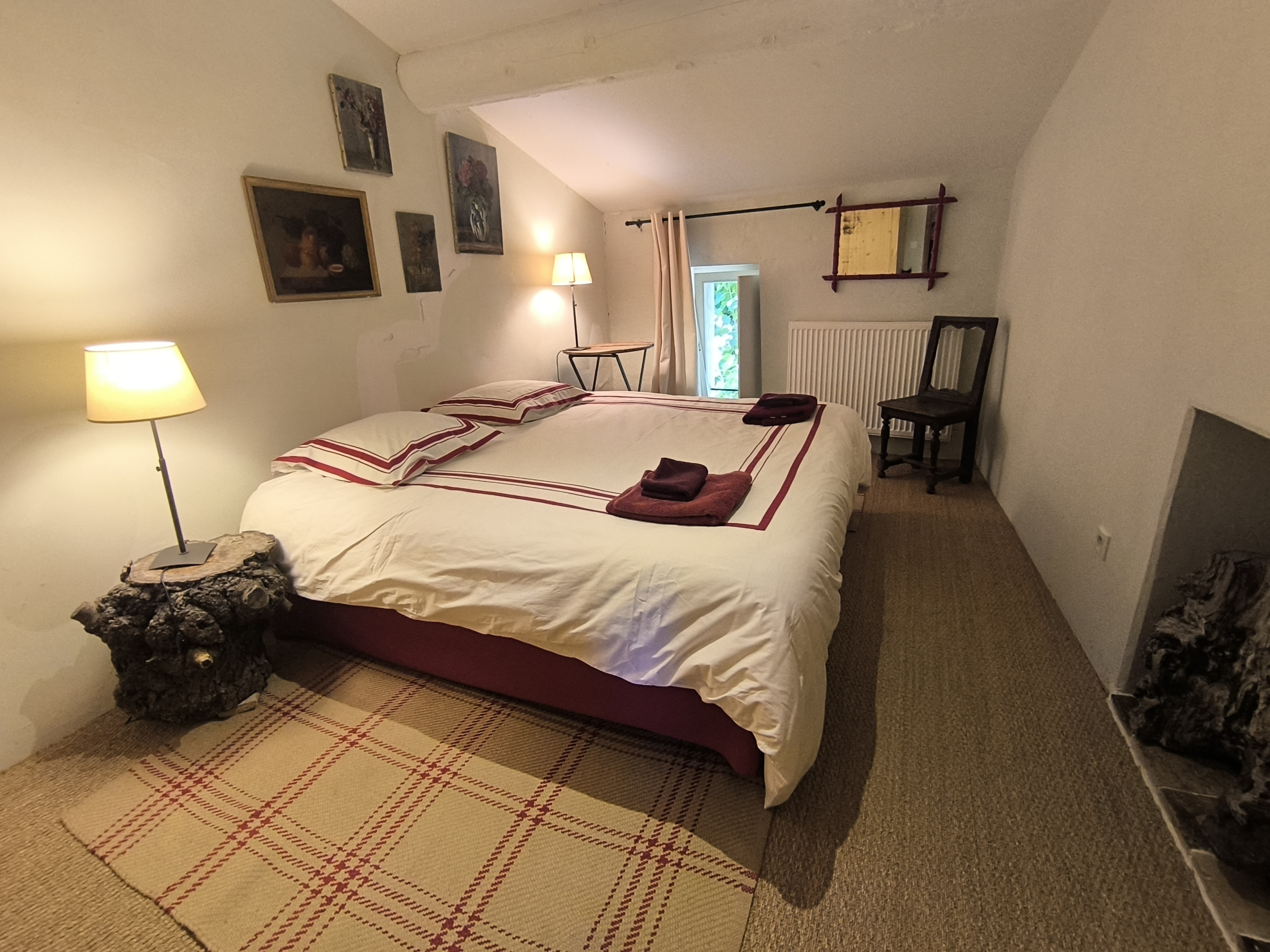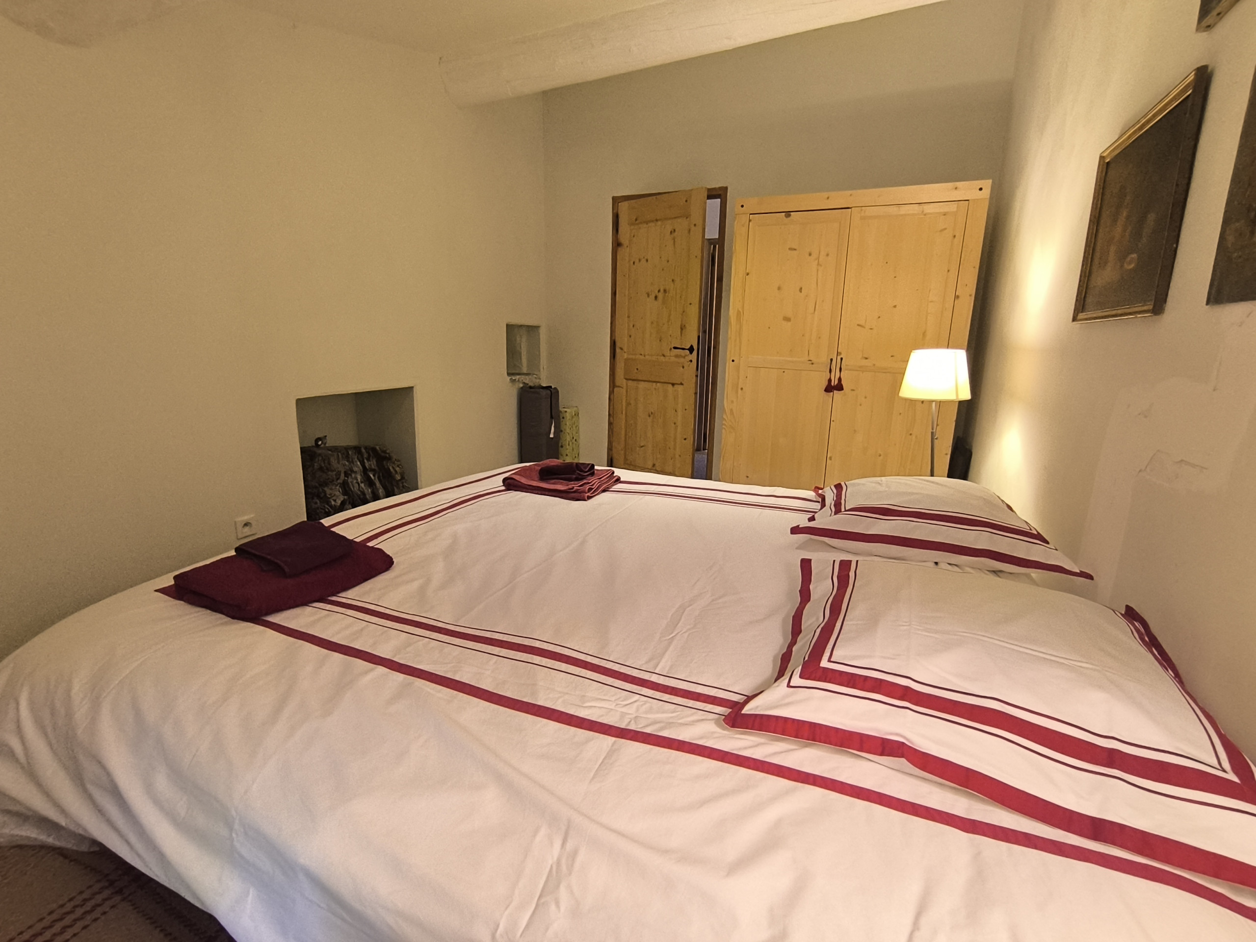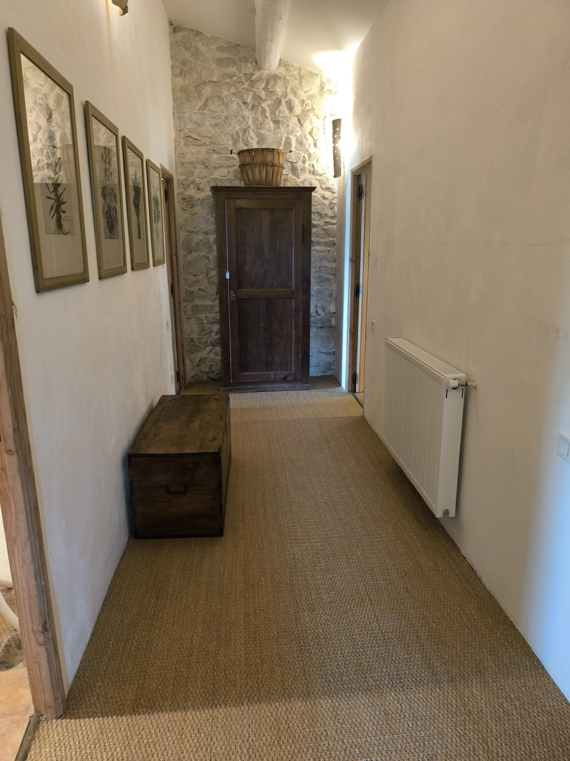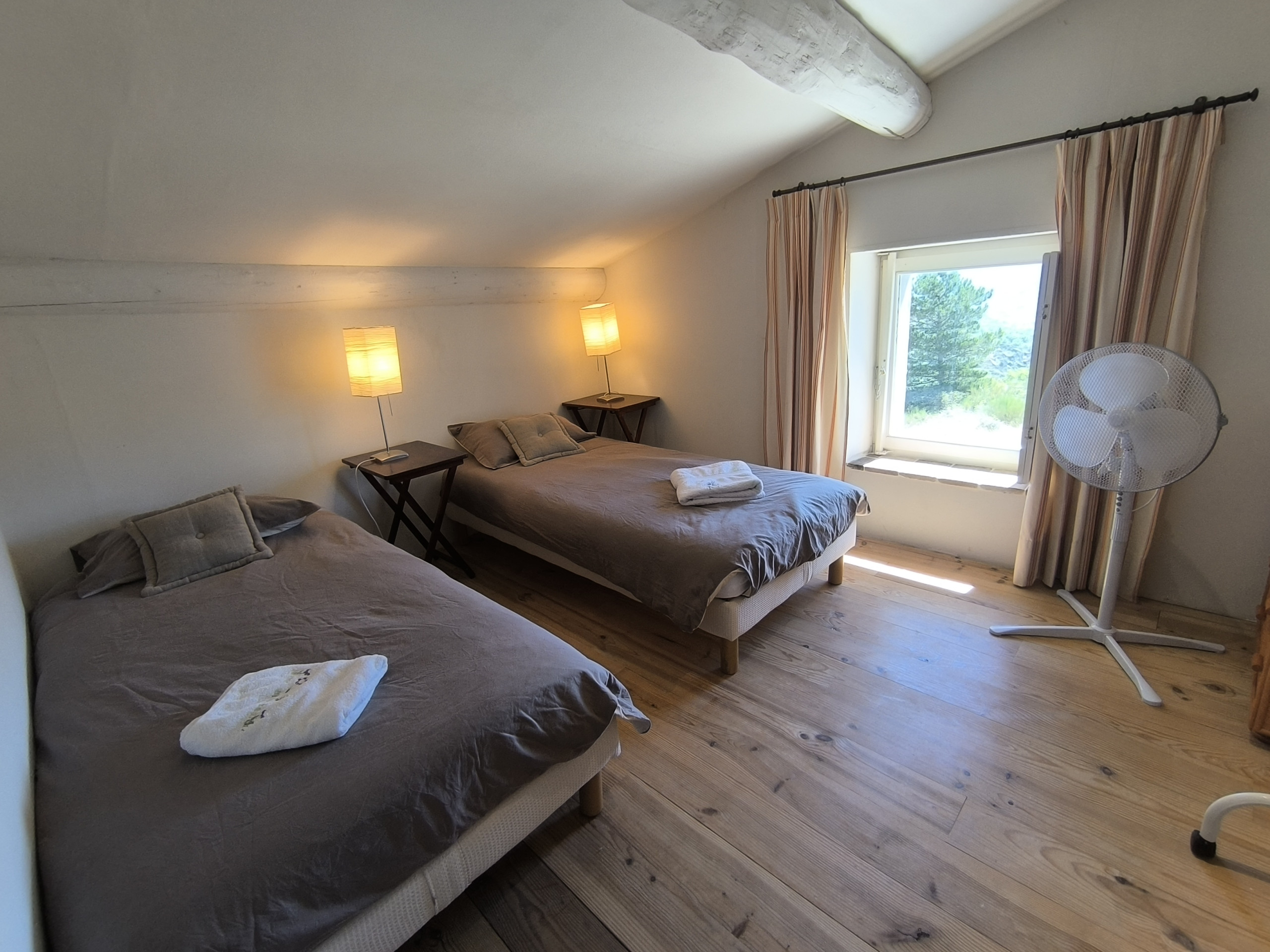 Prévue pour accueillir jusqu’à 16 personnes, elle offre une configuration idéale pour les familles et groupes d’amis: quatre chambres avec lit double, une chambre avec trois lits simples et une chambre avec deux lits simples, desservies par deux salles de bain et trois WC. Les chambres, sobres et lumineuses, ouvrent leurs fenêtres sur la garrigue et les crêtes lointaines; le chauffage au fioul assure un confort parfait hors saison.