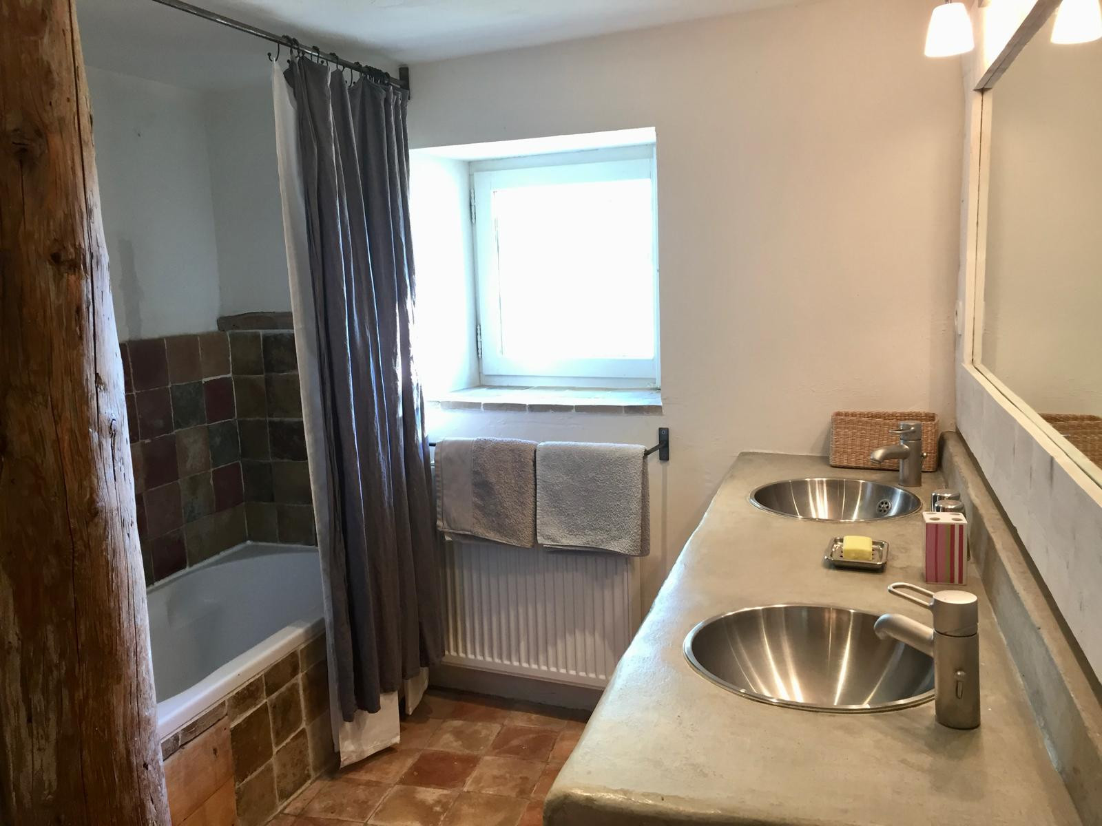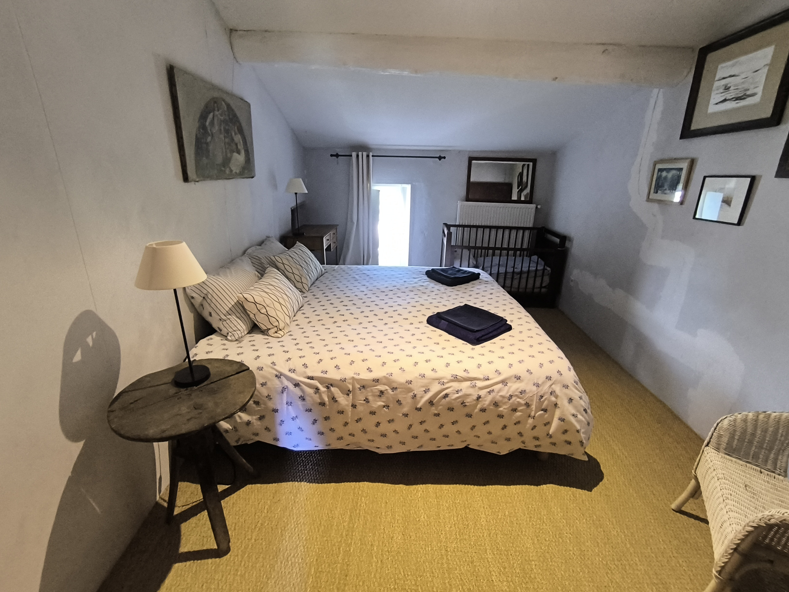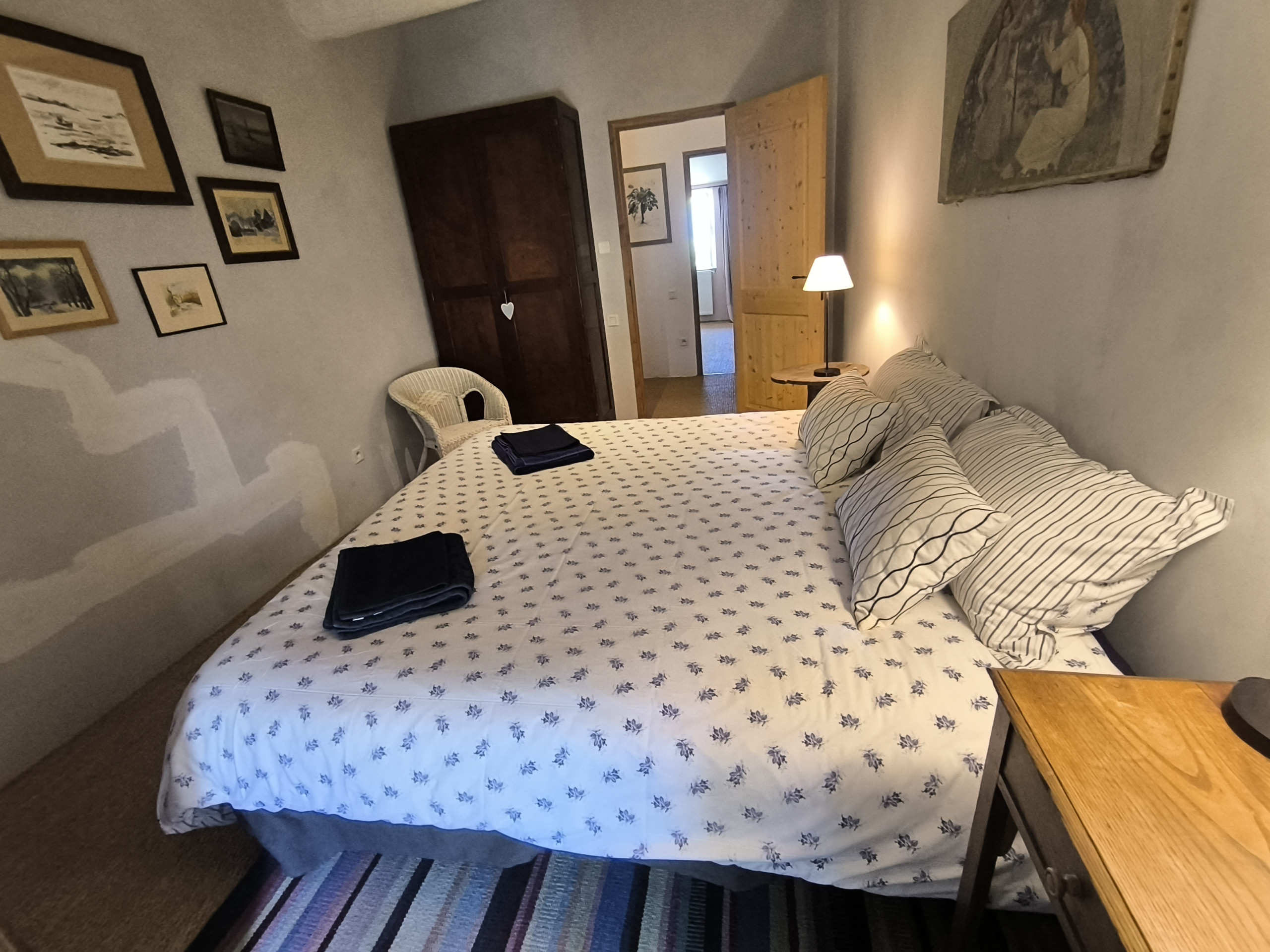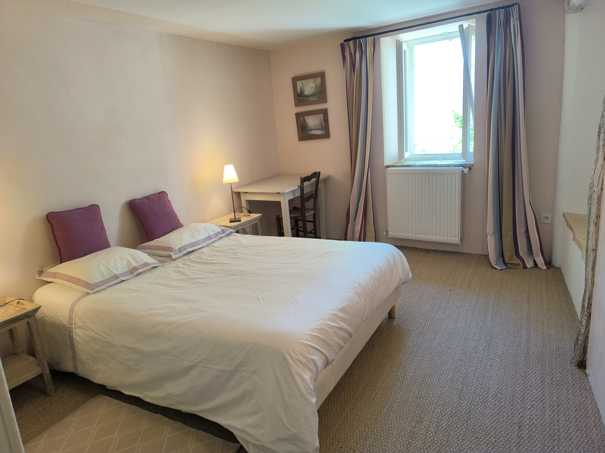 Prévue pour accueillir jusqu’à 16 personnes, elle offre une configuration idéale pour les familles et groupes d’amis: quatre chambres avec lit double, une chambre avec trois lits simples et une chambre avec deux lits simples, desservies par deux salles de bain et trois WC. Les chambres, sobres et lumineuses, ouvrent leurs fenêtres sur la garrigue et les crêtes lointaines; le chauffage au fioul assure un confort parfait hors saison.