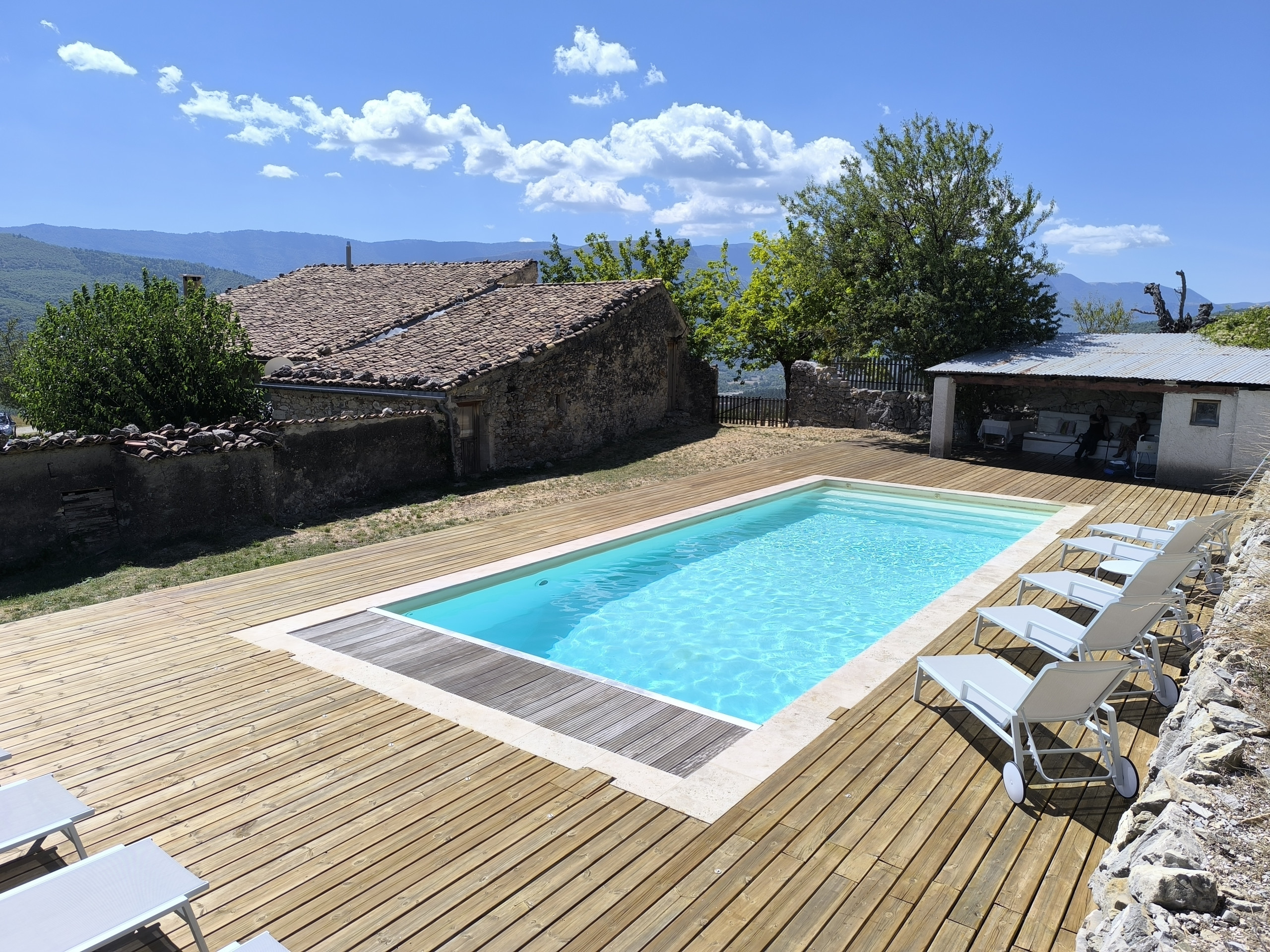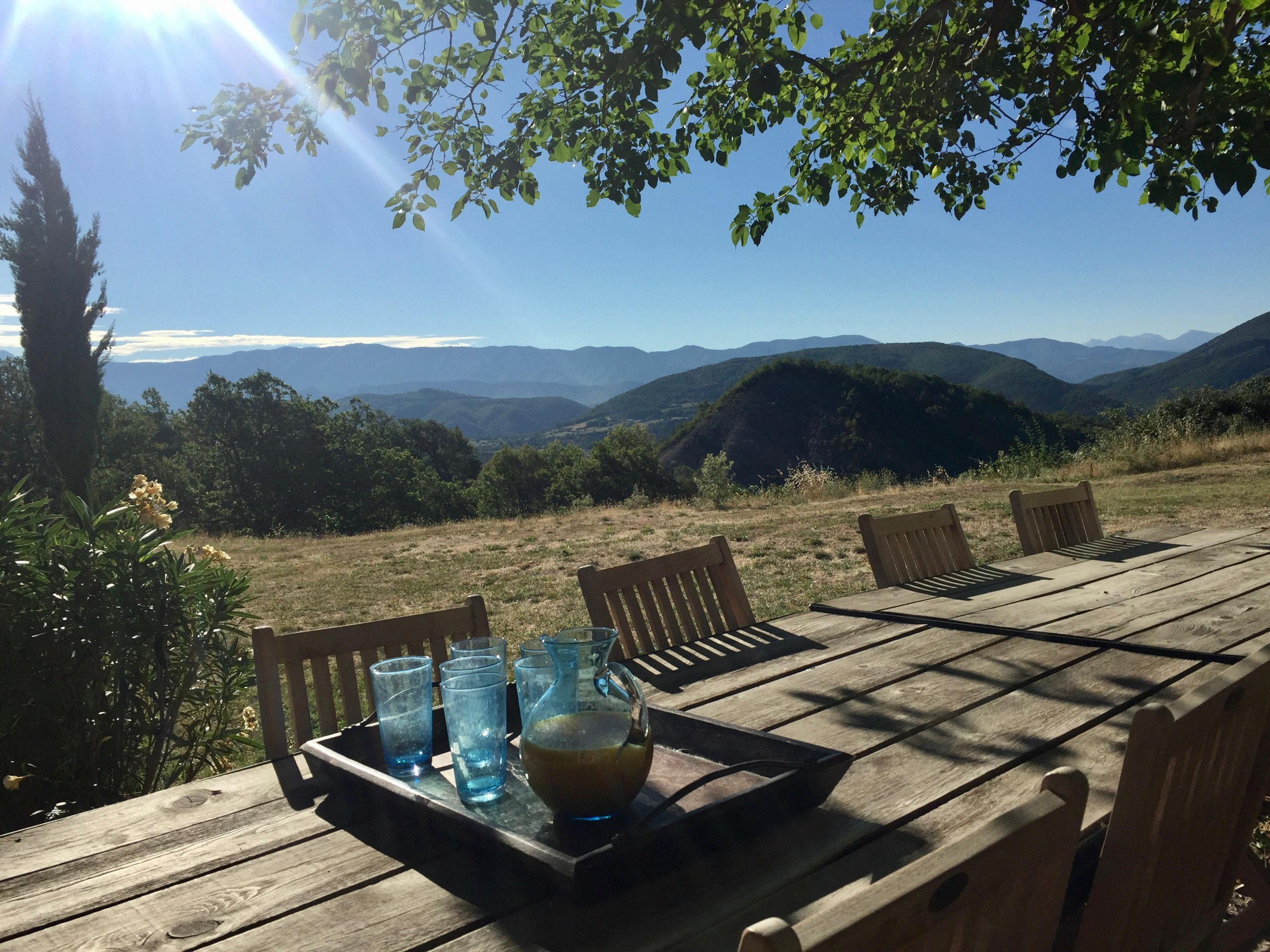Le terrain, véritable belvédère, déroule plusieurs terrasses et longues tables en bois pour petit-déjeuner au lever du soleil, déjeuner à l’ombre des feuilles et dîner sous un ciel d’étoiles. La piscine ( sécurisé dans une zone clôturé avec sécurité enfant et volet roulant) devient le point de ralliement de l’après-midi, avec la vallée pour horizon.