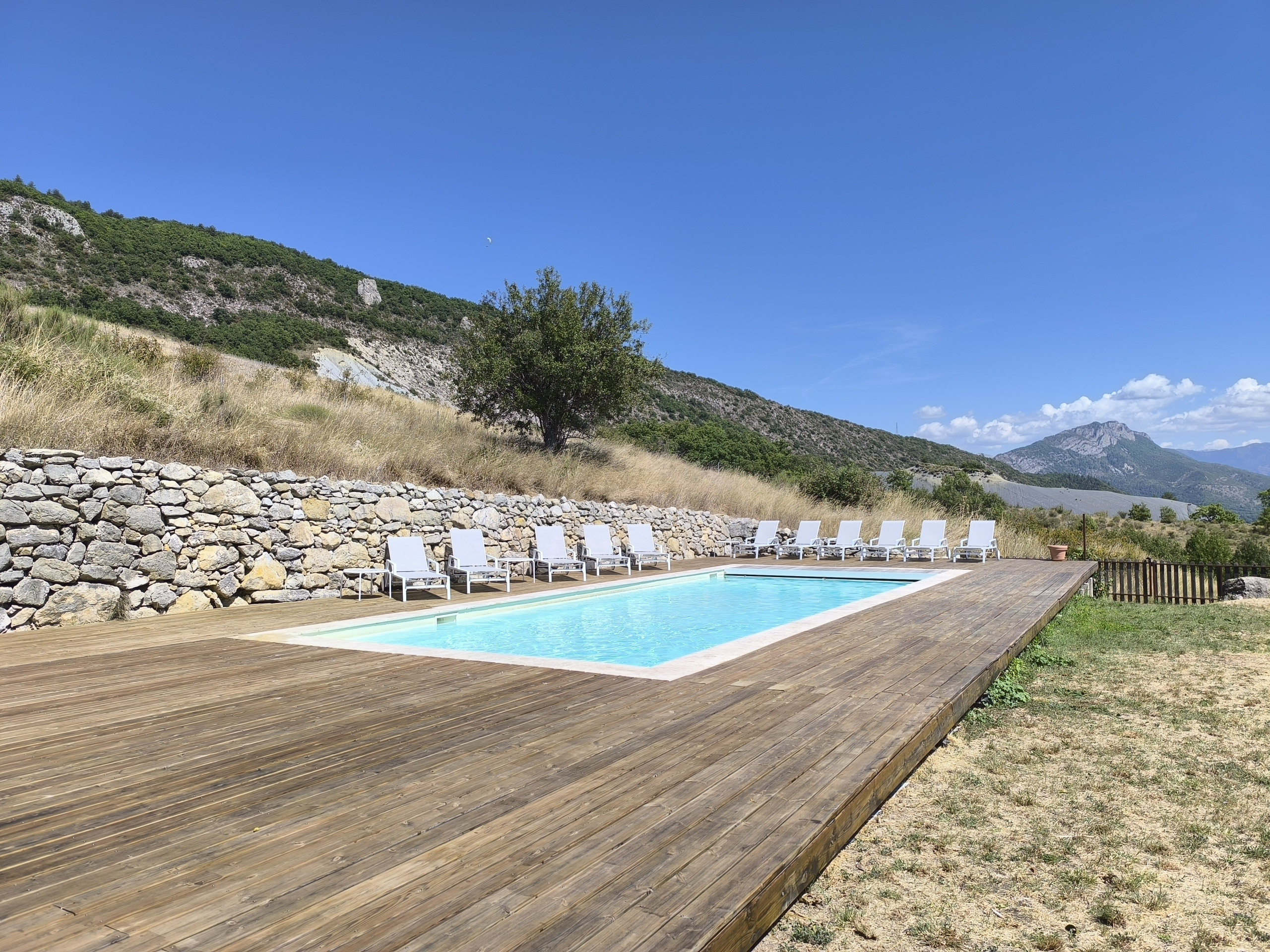 Perchée au-dessus de Sisteron, à l’entrée de la vallée du Jabron, cette ancienne bergerie entièrement rénovée est un refuge de caractère où la pierre et les voûtes s’allient au confort d’aujourd’hui. On y vient en tribu pour partager de longues tablées sous les arbres, profiter d’une piscine 10×4 m face aux montagnes et savourer le silence de la nature.
